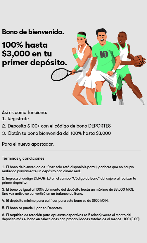 - Bono de deportes: 100% hasta $3,000 MXN (primer depósito)