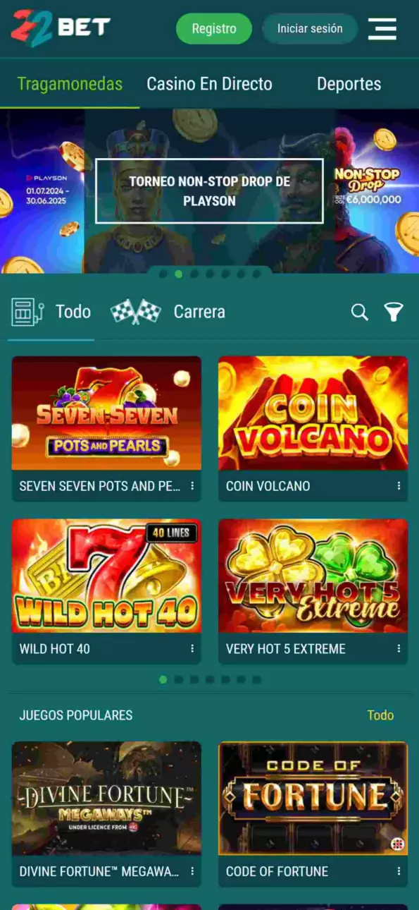 El casino de 22Bet despliega cuatro frentes reconocibles: